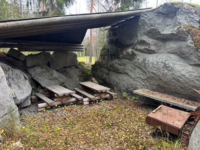 Yhteiskäytössä oleva grillipaikka, jossa kaikki mökkiläiset voivat nauttia ulkoilmaruoasta ja yhdessäolosta.